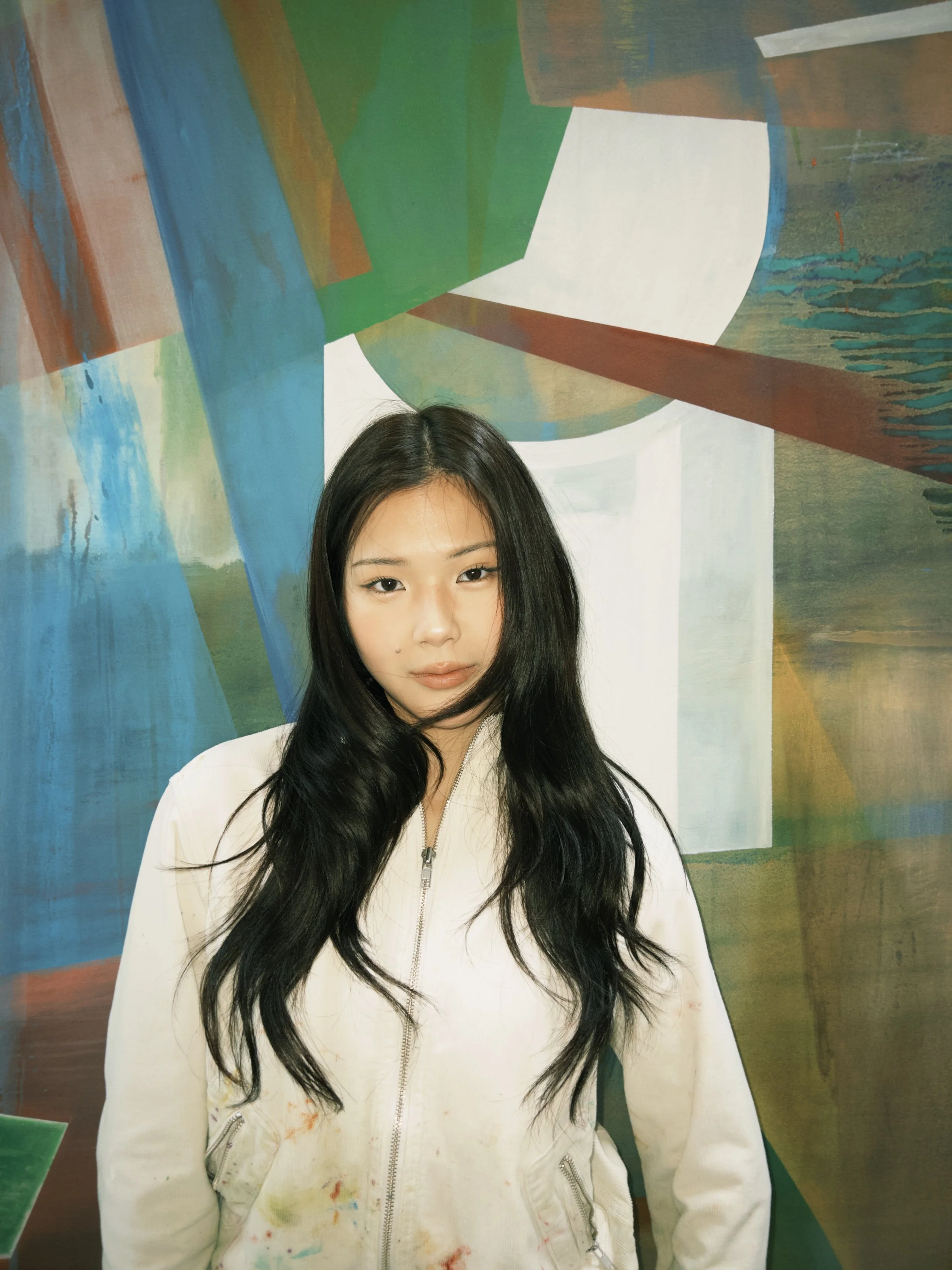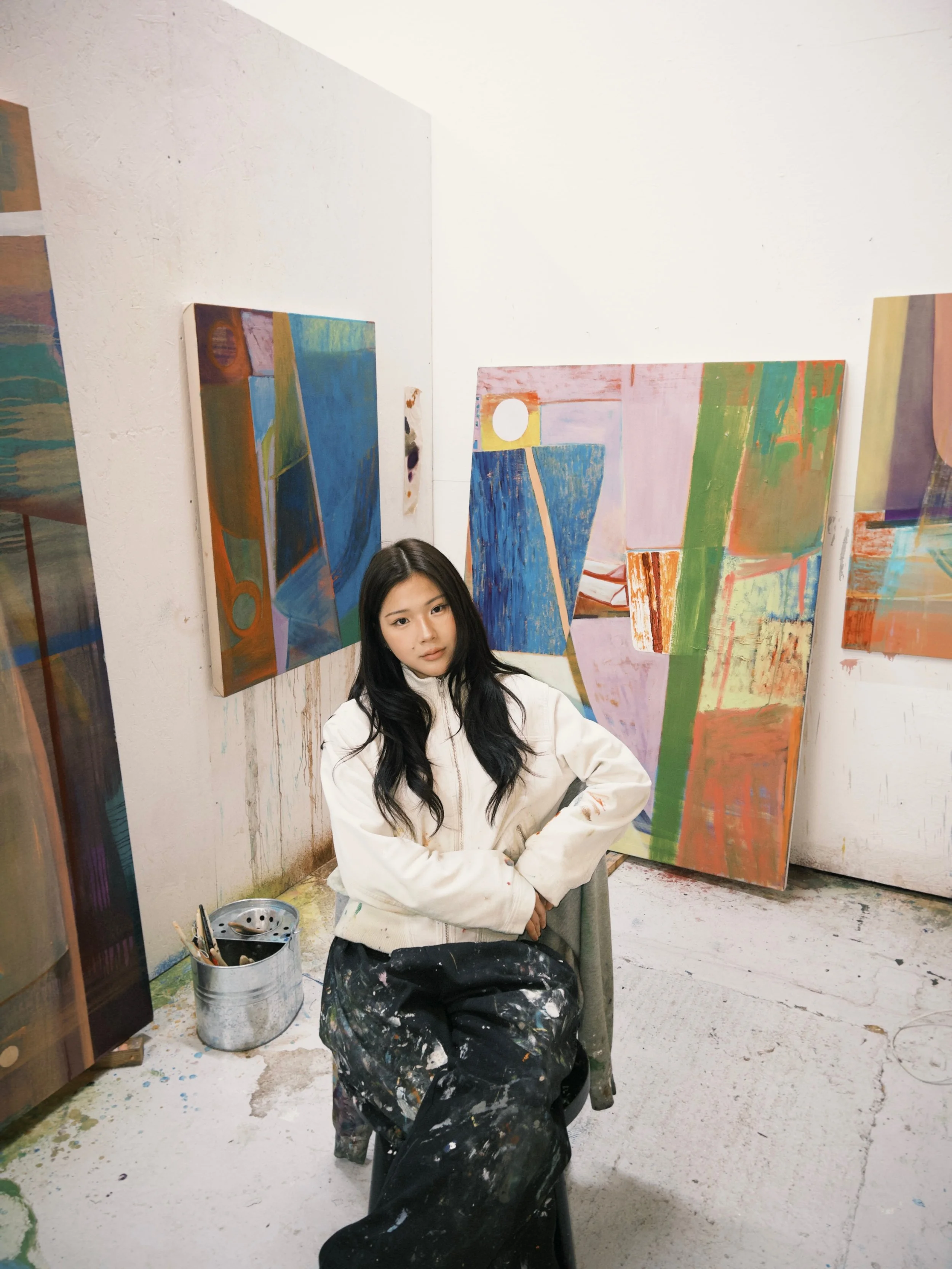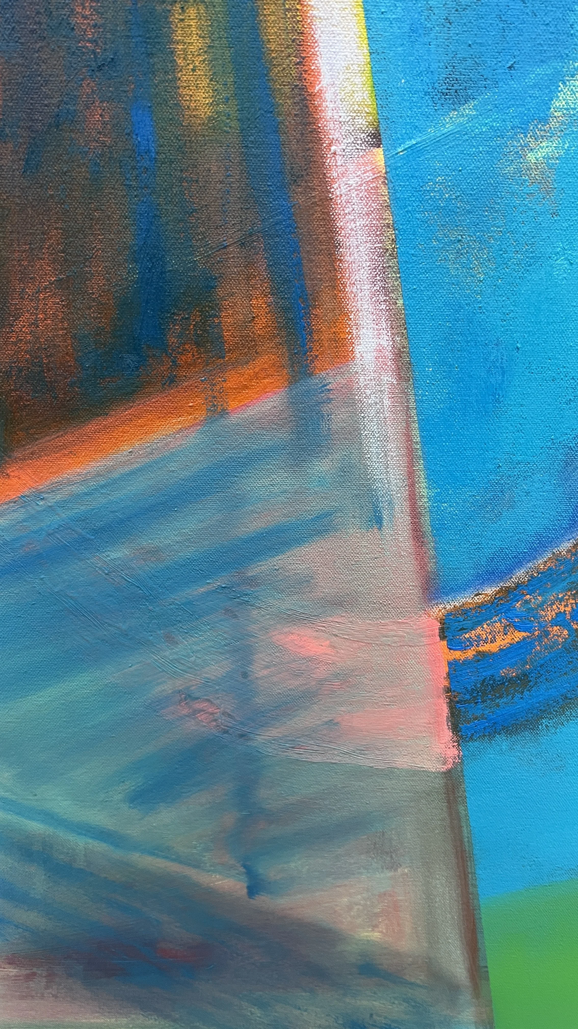 and that richness lies within. She paints this inner richness in its splendour and structural complexity. Her brushwork carries a delicate sense of touch – in the way she applies pressure to the brush, and in the transparency that emerges through her wet-in-wet technique. Foreground and background often flow into one another, while the brushstrokes run tender and translucent. Striking is the way space is constructed – not as backdrop, but as something active and inhabitable. Transparent layers of color, shifted planes and precisely placed forms create pictorial spaces that simultaneously open and condense. Soft, atmospheric gradients meet clear, bodily presences; hovering planes, linear interventions and block-like forms assert themselves and structure the composition. Color is deployed not decoratively, but architecturally: it builds tension, marks transitions and determines the rhythm of the painting.